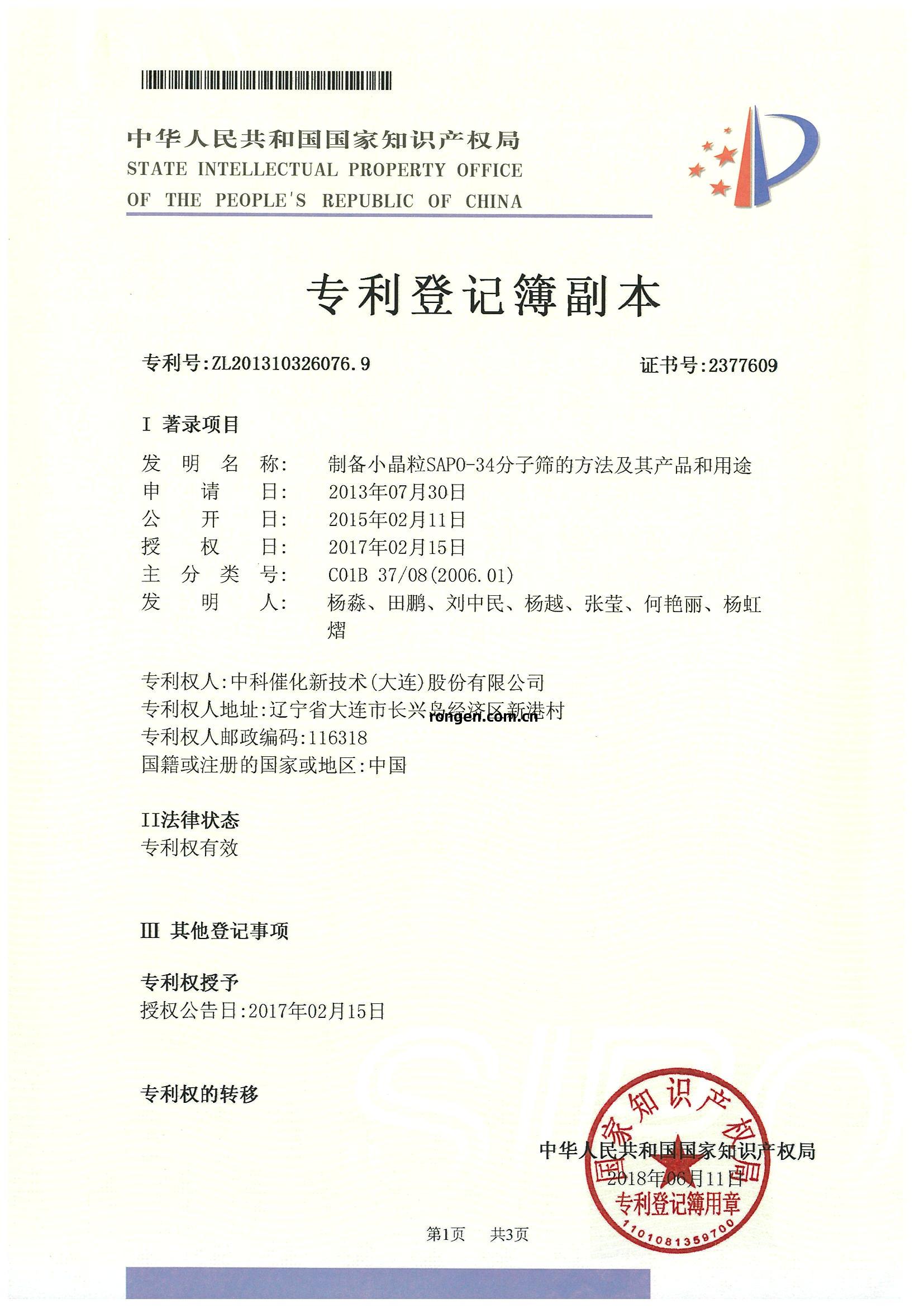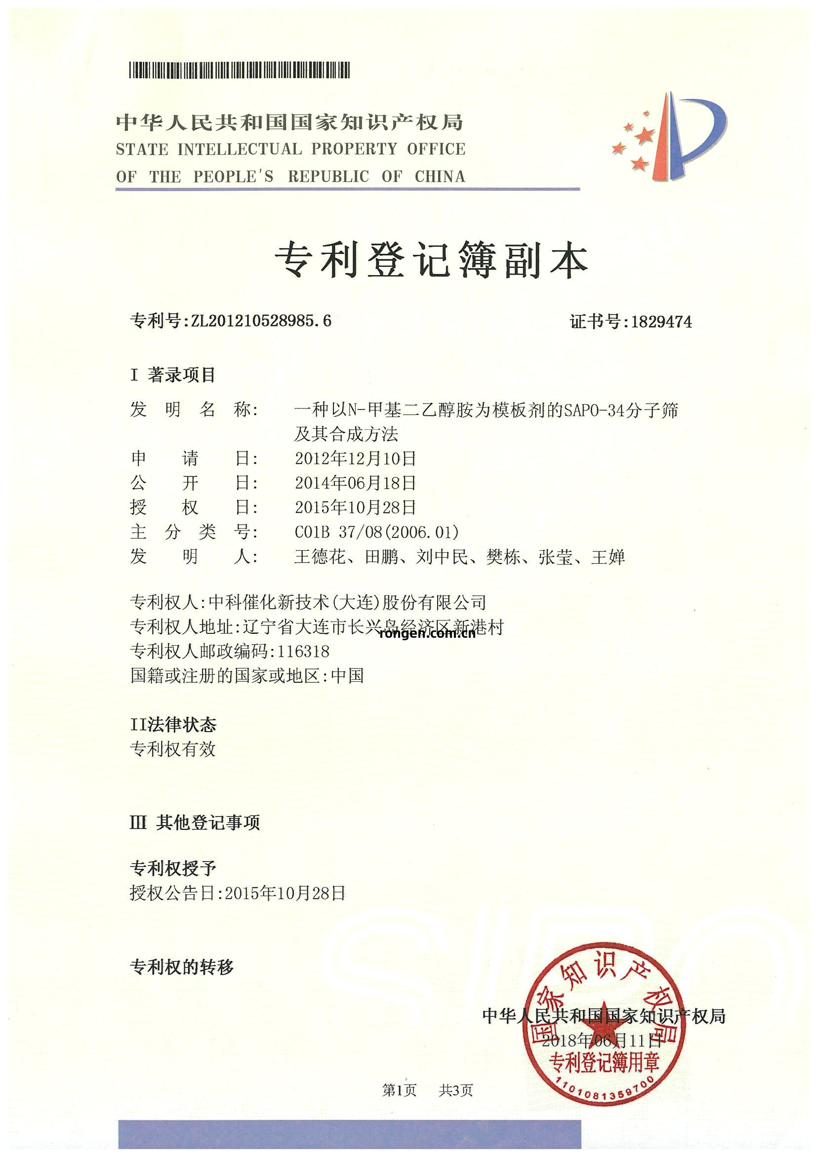 壹(yi)種(zhong)SAPO-34分(fen)子(zi)篩及(ji)其合(he)成(cheng)方法(fa)2037840