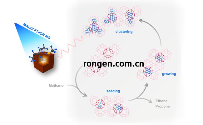 該(gai)項(xiang)研(yan)究中(zhong),研(yan)究團(tuan)隊(dui)結合(he)甲(jia)醇轉(zhuan)化為(wei)烯(xi)烴(ting)反應(ying),利(li)用高分(fen)辨質譜(pu)與同(tong)位(wei)素(su)標(biao)記技(ji)術(shu)相(xiang)結(jie)合(he)的(de)手(shou)段(duan),配合(he)理論(lun)計(ji)算,成(cheng)功(gong)解析(xi)了(le)之(zhi)前(qian)未(wei)知的(de)高(gao)分(fen)子(zi)量的(de)復(fu)雜(za)積(ji)碳分子結(jie)構(gou),系統研(yan)究了(le)積(ji)碳生長過(guo)程(cheng)中(zhong)初始(shi)積(ji)碳基元物種(zhong)在分(fen)子(zi)篩籠(long)間(jian)的(de)交(jiao)聯(lian)生(sheng)長(chang)過(guo)程(cheng),給出了相(xiang)對(dui)完(wan)整的(de)甲(jia)醇制(zhi)烯(xi)烴(ting)反應(ying)積(ji)碳演變路(lu)徑(jing):SAPO-34分(fen)子篩籠(long)內(nei)活(huo)性烴(ting)池(chi)物種逐步(bu)擴(kuo)環、稠環化生(sheng)成(cheng)3至(zhi)4個(ge)環的(de)積(ji)碳前(qian)軀體(ti),隨(sui)後這(zhe)些積(ji)碳結構基(ji)元通(tong)過(guo)共價(jia)鍵(jian)跨(kua)籠(long)交(jiao)聯(lian),形(xing)成(cheng)多核(he)、類(lei)納(na)米(mi)石墨(mo)烯(xi)結構(gou)的(de)稠(chou)環芳烴(ting)物(wu)種。這類跨(kua)籠(long)交(jiao)聯(lian)的(de)稠(chou)環芳烴(ting)物(wu)種嚴重(zhong)阻礙(ai)反應(ying)傳(chuan)質(zhi),導致(zhi)催(cui)化劑(ji)失(shi)活。隨(sui)後的(de)拓(tuo)展(zhan)研(yan)究發(fa)現(xian),跨籠(long)積(ji)碳失(shi)活行為在(zai)其(qi)他籠結(jie)構分(fen)子(zi)篩催(cui)化體(ti)系也普(pu)遍存在(zai)。