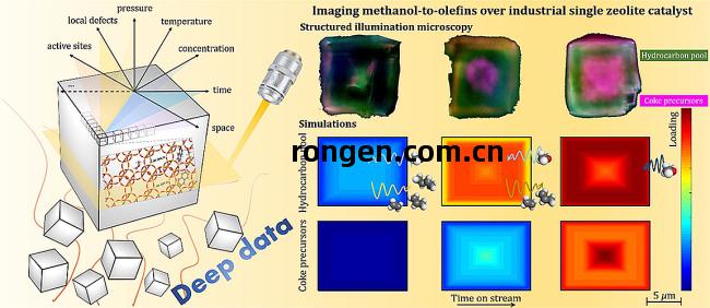 甲醇(chun)制(zhi)烯(xi)烴(ting)打(da)通了(le)煤(mei)、天然氣以及生物質(zhi)等(deng)非(fei)石(shi)油(you)原(yuan)料(liao)生(sheng)產(chan)低碳(tan)烯(xi)烴的技(ji)術路(lu)線(xian),已(yi)經成為(wei)我(wo)國乙(yi)烯(xi)丙烯等(deng)大(da)宗(zong)化(hua)學品(pin)的重(zhong)要生產(chan)方式。甲醇(chun)制(zhi)烯(xi)烴(ting)反應采用(yong)的分子(zi)篩(shai)催(cui)化(hua)劑,由於獨(du)特(te)的孔道(dao)結構限(xian)制(zhi)了(le)分(fen)子(zi)傳(chuan)質(zhi),使得(de)其在實(shi)現較(jiao)高低碳(tan)烯(xi)烴選擇性(xing)的同時也加(jia)快(kuai)了(le)催(cui)化(hua)劑積(ji)碳(tan)失(shi)活(huo)。因此,獲取(qu)分(fen)子(zi)篩(shai)晶(jing)體內由於傳(chuan)質(zhi)限(xian)制(zhi)導致的反應物和產(chan)物的時空(kong)非均(jun)勻分布(bu),對(dui)於理(li)解(jie)催化(hua)劑積(ji)碳(tan)失(shi)活(huo)機理(li)具(ju)有重(zhong)要意(yi)義。目前(qian)常用(yong)的時空(kong)分辨(bian)光譜(pu)成(cheng)像技(ji)術很(hen)難(nan)同(tong)時獲取(qu)催(cui)化(hua)過程中(zhong)分(fen)子(zi)篩(shai)晶(jing)體內反應物和產(chan)物分(fen)子(zi)、積(ji)碳(tan)物種以及酸性(xing)位點的完(wan)整(zheng)時空(kong)演化(hua)信(xin)息(xi)。