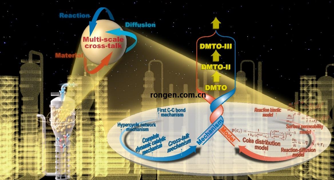 近日,中(zhong)國(guo)科(ke)學院(yuan)大連化學物(wu)理研(yan)究所(suo)(以(yi)下(xia)簡(jian)稱“大連化物(wu)所(suo)”)低碳催化(hua)與工(gong)程(cheng)研(yan)究部(bu)(DNL12)劉中民(min)院(yuan)士、葉(ye)茂(mao)研(yan)究員(yuan)、魏(wei)迎(ying)旭研(yan)究員(yuan)、田(tian)鵬研(yan)究員(yuan)團隊(dui),受邀發(fa)表了甲醇制烯(xi)烴領(ling)域(yu)Perspective評述文章,系(xi)統(tong)總結了團隊(dui)理解(jie)和(he)調控甲醇制烯(xi)烴動態(tai)復(fu)雜催(cui)化體系(xi)的(de)觀點(dian)和(he)研(yan)究成(cheng)果(guo),包括動態(tai)催(cui)化(hua)原理的提(ti)出(chu)和(he)定量模(mo)型的(de)凝(ning)練(lian),以(yi)及(ji)其(qi)與(yu)新(xin)壹(yi)代甲醇制烯(xi)烴(DMTO-III)技術(shu)的(de)內在(zai)聯系(xi)。